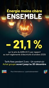 Alors que les tarifs réglementés de vente restent 20% supérieurs à ceux qui prévalaient avant la crise de l’énergie, et que l’incertitude demeure sur les évolutions des prix de l’électricité au cours des prochaines années, l’UFC‑Que Choisir d »Amiens Somme a lancé un appel d’offres auprès des fournisseurs nationaux, organisé par la filiale SAS Que Choisir et propose aux consommateurs un achat groupé autour de l’offre « Énergie moins chère ensemble », à prix fixes 2 ans, avec 21,1 % d’économies (HT) sur la consommation d’électricité par rapport au tarif réglementé de novembre, soit la meilleure offre à prix fixes actuellement sur le marché. Cet achat groupé, dont l’offre est garantie aux 150 000 premiers souscripteurs, court jusqu’au 20 décembre 2025 inclus.